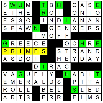 This grid was slightly smaller than normal (13×13 instead of the standard 15×15) to avoid any extraneous prime-numbered squares – every square with a prime number in it is used in the contest answer. Several solvers commented on the impressively clean fill given this somewhat unforgiving constraint!
